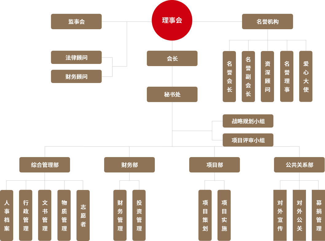 理事会:统筹基金会全部工作安排及对部分岗位的提名选任。